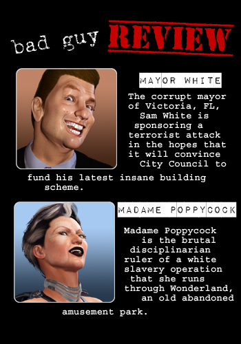 I haven't updated this comic since forever, so I guess I'll go ahead and put something up. I have no idea when I'll be able to get back to a "normal" update schedule, but for right now all I'll try to do is at least get up one new page a week. That may be overambitious! I'm definitely not going to be able to keep up as rapid a schedule as before. Sorry for the boring page. It's the beginning of a new chapter and there were some new characters to introduce. The chapter gets more interesting in a few pages. Can't blame you for not reading all the text. Basically, the mayor is meeting up with the contractors who are going to build his massive project when City Council grants him the funds. That's who they are. And for any new readers (or people who just forgot because I haven't been updating), here's a quick refresher on who's who here: