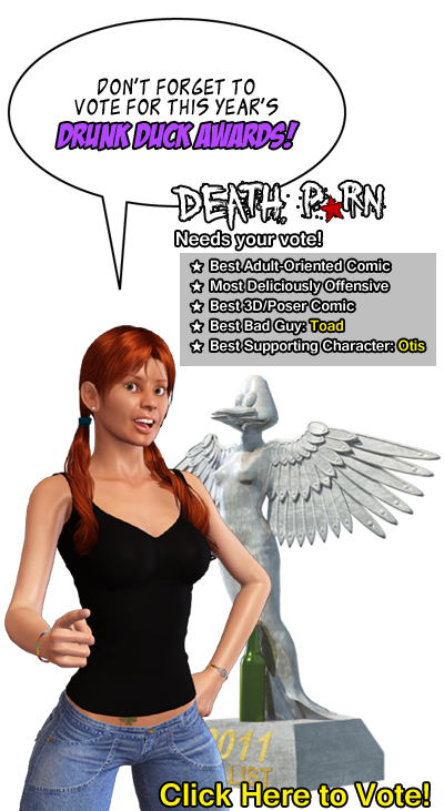 I'm still taking a break right now before I start the next chapter of the comic, and might wait until I build up a little bit of a page buffer before I start posting new pages. The story is very near its conclusion now, and this is where the serious bloodletting begins! Also, for those of you who haven't already, don't forget to vote for us at this year's Drunk Duck Awards! The polls close on the 25th, so there's only a couple of days left to take part, and Death P*rn needs your vote! We're trying to get nominated in these categories: - Best 3D/Poser Comic - Best Adult-Oriented Comic - Most Deliciously Offensive - Best Bad Guy: Toad - Best Supporting Character: Otis Here's a link to the Drunk Duck Awards ballot . You don't have to fill in every category. And of course, it's awesome if you want to vote for this comic in other categories besides the ones listed above, but please don't go through putting my comic for every single one of them. The awards staff don't like that! Drunk Duck Awards Ballot
