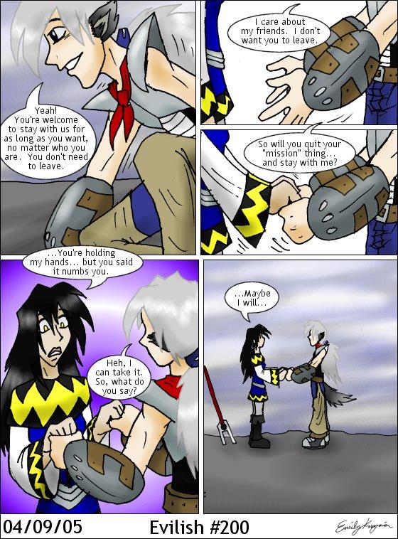 I'm just temporarily putting my comic here until my site is back up. I will delete all these pages when my site is working again. Please don't link to the DrunkDuck account; instead, link to http://evilish.pensandtales.com