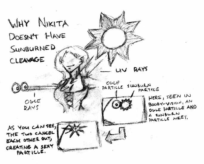 I got a cool drawing in my inbox the other day from a guy called Lee- it made me giggle, and I thought you guys would appreciate a look. :) Why Nik doesn't get sunburned cleavage It's a highly mathematical formula. ;) The song Matey is singing is Seven Deadly Sins by Flogging Molly. They have songs about pirates! It's awesome. ^_^
