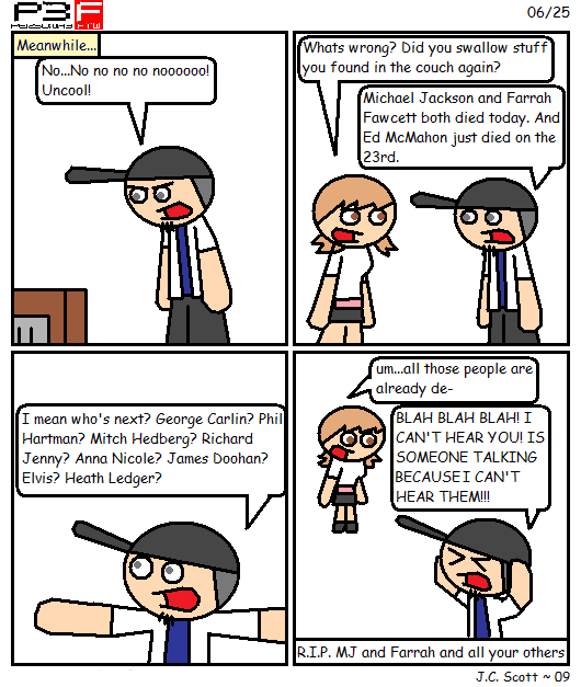 Most of what he says IS true, except the last panel. I was just eating a lot of green onions at the time. Additional: As some of you may have figured out by now, two people have died today. And so I drew this comic to show what was going on at the dorm while the MC is out clubbing. http://i85.photobucket.com/albums/k74/Strain42/RIP.png
