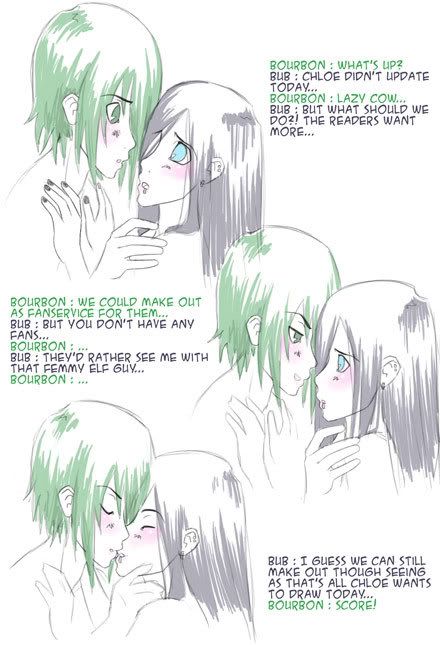 Sorry it's late~ I wanted to get this up yesterday but I couldn't ink it because my room was too bright to use my lightbox (I've got no curtains and it was uncharacteristically sunny in England that day~). So I did it last night… just finished it now~ I sure am getting faster at inking - I did two pages in the time Holby City was on (an hour) when it used to take me all of The Wright Stuff and This Morning to ink a page… XD Yes, I judge my time by what's on TV… ahhaa… ^^; And I was busy drawing rubbish like http://img.photobucket.com/albums/v290/wyldflowa/Manga/bubbourb3.jpg yesterday too… Bub x Bourb love~ I think only Mr Sherbet would spoon out like that over someone using long words… and Turps got bopped on the nose by Bub… I kinda wish I'd drawn it now… but page restraints are making me give surplus parts of the story the chop. ;_;
