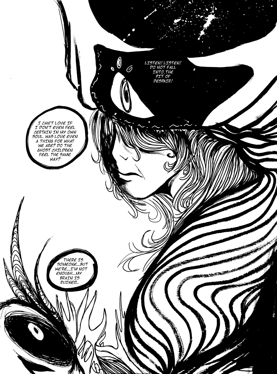 much of this series is based on things in my life and people i knew, i was with a strange person the time i was writing it and drawing some of the early chapters. some of their behavior lives on in this comic, so i could never forget this person. but not in a way where you get those ridiculous "what could have been". more of a strange sense of being seen as a specimen? i don't know if that makes sense.