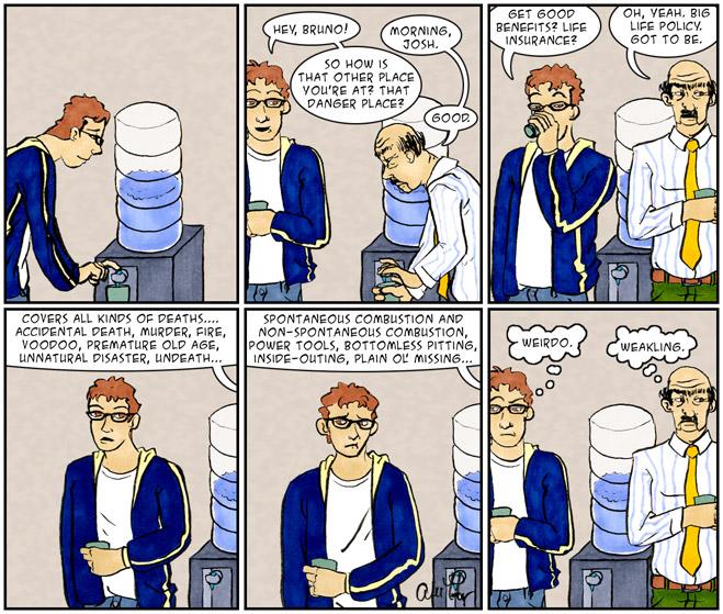 The Repository of Dangerous Things First Prev - 121: Wherein we say farewell (or hello) to our cast of remarkable characters. - 120: Horseshoe crabs have weird eyes, I bet they see in black and white. - 119: Even monsters and zombies need a little attention sometimes. - 118: The robot is probably the brains behind the whole plan. - 117: I'm not sure what he expected, with a duck in charge. - 116: The question is, why not a sea captain? - 115: You would think she'd get cold, walking around like that. - 114: Everyone say hello to the new fan favorite character! - 113: If you love something, set it free. And hope it doesn't break stuff. - 112: What tragedy will next befall our young hero?! - 111: Davis is gonna pay for that (but at least he has money now). - 110: If you invite them, prepare to put up with them. - 109: Something cheesy about growing friendships. And dangerous plants. - 108: This one will just be called "The Gratuitous Comic." - 107: Who knew that mathematicians lived so dangerously? - 106: The Repository of Romantically Inept Things. - 105: It does kind of make you wonder why she needs Davis. - 104: Daydreams aren't really dangerous... more like trespassing. - 103: Dangerous things aren't just for grownups. - 102: You can't change her mind, so don't try. - 101: It's nice to know some things never change. - 100: You would think this might make the foundations a little unstable? - 099: But the anticipation is the best part! - 098: Either she's loosening up or he's getting more insane. - 097: He probably doesn't realize how close he is to being right. - 096: I don't think I want to know how it knows what he's thinking. - 095: Davis's problem is, the boy just don't learn. - 094: We now return to our regularly scheduled programming. - 093: As a matter of fact, Davis isn't very good at cards, either. - 092: And you wonder why Ms. Harper doesn't get dates? - 091: Get back on that horse, Davis! - 090: There are some questions that should never be answered. - 089: Well, it makes sense to me anyway. - 088: One of these things is not like the other.... - 087: But more than cute enough to make up for it, it seems. - 086: When in Rome... or when Romans visit? - 085: Well, now Davis has two little brothers. - 084: Sometimes a quarter will get you more than you expect. - 083: Like National Geographic, only the naked chicks are hot. - 082: Wherein Davis finally gets some real-world experience. - 081: So, is that just his imagination, or...? - 079: I guess it's back to business as usual. - 078: ...There is only attack and attack and attack some more. - 077: I wonder if Davis has ever called LoveLine - 076: Davis: Man of Undergraduate Action! - 075: Ah, what Davis doesn't know (this time) won't hurt him. - 074: Whot we 'ave 'ere is a tzitzimime! Ceahfuhl, the buggas boite! - 073: Fighting soldiers from the sky; fearless men who jump and die... - 072: She quit the CIA because it was too boring. - 071: This is hardly the time to think of witty titles! - 070: Why can't any cute and harmless things have died to bother them? - 069: What's big and blue-green and goes "schlomp?" - 068: If he had boots, they'd be made for walkin'. - 067: And you thought I forgot about the monkey deathbot! - 066: I wonder if his name was Yorick? - 065: Davis knew that class would come in handy one day. - 064: Every good plan involves a secret weapon. - 063: Well, it was a nice try, anyway - 062: Davis never did get along well with books. - 061: Sometimes, the truth really, really hurts a lot. - 060: Whatever happened to Marines not leaving any man behind? - 059: When the Silly String runs out, use small talk. - 058: Bruno the vampire slayer? - 057: Synchronicity. It's a good thing. - 056: If there's anything girls hate, it's giant slugs. - 055: Golem can be gentle when he wants to be. - 054: Davis plays way too many video games. - 053: Optimism is helpful in times of stress. - 052: Good. Then that only leaves one person to worry about. - 051: Wherein both a deepest fear and a greatest desire are fulfilled. - 050: Monday mornings always hold the most unpleasant surprises. - 049: Good day, sunshine. - 048: It must be a cold day in Hell. - 047: Okay, maybe Davis is a little bit of a fighter. - 046: Davis is a lover, baby... not a fighter! - 045: A dying man's last wish. - 044: Time slows down when bad things happen. - 043: I can think of at least two things that make Davis thankful. - 042: Is that Davis's life flashing before his eyes? - 041: Famous last words. - 040: If you're not going to believe me, why do you ask? - 038: Now with real monkey action! - 037: They just want to hug you. Really. - 036: Kind of like the monsters what live in your closet. - 035: No, I don't think I'll take door #3. - 034: Justifiable Homicide. - 033: Finally, the (unsurprising) truth comes out. - 032: Sometimes Ms. Harper even scares me. - 031: The Force is strong in this one. - 030: Fiesta! - 029: Davis just can't get ahe... Davis loses his hea... Djinn: 1, Davis: 0. - 028: You'd think Davis would learn "convenient = weird" at work. - 027: The dangers of mediocrity. - 026: The dangers of being an impressionable lump of clay. - 025: The dangers of binge drinking as a form of escapism. - 024: The dangers of taking expired antibiotics... unless this is normal. - 022: Golem don't truck with no fools. - 021: What Davis doesn't understand is, he's tasty. - 020: Of all the things he's lost, he misses his hair the most. - 019: At home, he screens all of his calls. - 018: Making Friends. - 017: But will it protect him from death by monkeys? - 015: Not your average voodoo doll.... - 014: Oh smooth, Davis, real smooth. - 013: Sorry, Davis, but the pants are pretty important. - 012: Don't ever look too close. - 011: The good thing about Dangerous Things is, they blow up. - 010: "Nice try, Miz Harper!" - 009: Mocha hazlenut blood. - 008: Dude... what is in that jar? - 007: Or not. - 006: Finally, someone is on Davis's side! - 005: Forks Plastic - 004: 