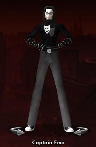 And the winner of the first SuperFogeys Create-A-Character Contest is… Drumroll, please. Are you drumming? And the winner is… Captain Emo! This entry came from William D. Sharpe, III . Congrats, William! His original character description is as follows:Captain Emo Captain Emo's emo-ness progressed to super-human levels, allowing him to empathically share pain with other, both in giving it to them, or taking their pain on himself. Fish-belly white skin, long black hair that often hangs in his face, he wears glasses and has a Van Dyke beard. His outfit is a black long sleeved shirt with the comedy and tragedy masks on it, long black gloves wrapped in (fake) barbed wire, faded jeans (formerly black, now faded to grey), grey and white tennis shoes, and a cloth wrap around the waist, with more (fake) barbed wire. This was a tough, tough decision. Seriously, you have no idea. Every entry I received had something to recommend about it and that I could have easily used in the strip. In the end, Captain Emo won because of the great name and the slightly pathetic nature of the character. (And the great visual–I'm only making a couple of modifications, but he should look pretty great.) Plus, I think his powers are really unique and I can easily have a lot of fun with him. His MySpace page will be hitting soon, but another thing that appealed to me about Captain Emo was that I can see him fitting into my plans for Chapter 6. So, congrats again to William and thanks to all of you who entered. This was so much fun that we may do this again someday. Certainly, I'd love to do another contest of SOME sort. Hope everyone enjoys today's strip! Groundwork is being laid for a big reveal around strip #100. Get ready for it!