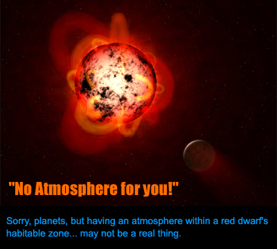 Unfortunately, the prospects for life developing around red dwarfs took a major blow earlier this year, when NASA researchers discovered that habitable zones around these stars is not a healthy place for planets to form. Specifically, it's not a place where planets can hold onto an atmosphere very long. As it turns out, red dwarfs are extremely active stars and emit tens of times more dangerous X ray and ultraviolet radiation than our sun. They also produce massive stellar ejections and so-called “superflares” on a frighteningly regular basis. In some cases, superflare events which happen on our sun maybe once every 200 years, have been observed happening every 2 hours on red dwarfs. Considering that the habitable zone for one of these stars is 20 times closer in than in our own solar system, this is bad news for any developing atmosphere. Even with a magnetosphere to blunt some of the effects, it's expected that an oxygen-nitrogen atmosphere like ours would last at most 10 to 20 million years under these conditions.