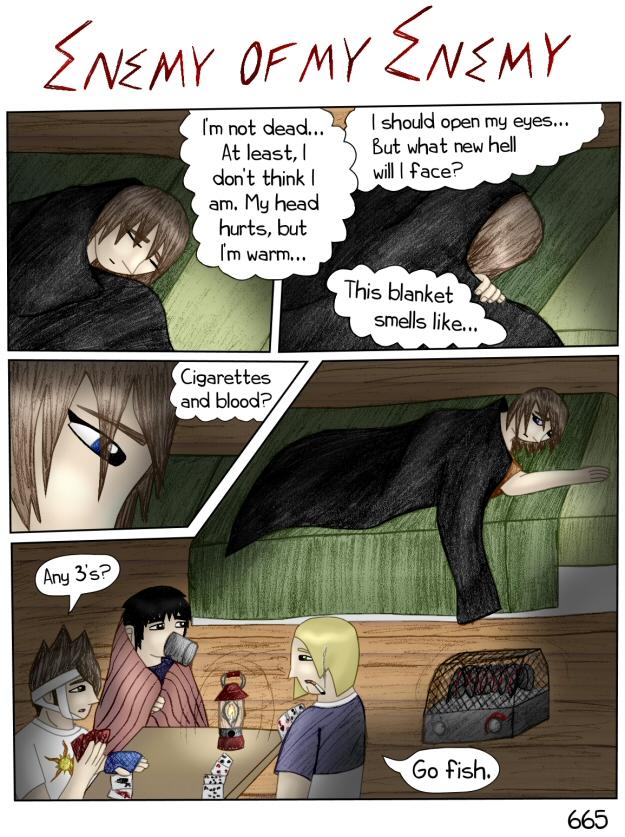 I'm proud of this title. ^_^ It is actually a spin on a line spoken about a hundred pages ago – and it refers to the same characters. I like this page, even though I allowed too much space for the title, couldn't think of any cute chibis to use, and the page ended up the wrong dimensions (not tall enough).ghostrunner: Lol. He kinda does.Tantz: Not too long a wait. ;-) And Raidon did make some progress with Kaida – spontaneous or not.Peipei: Kaida doesn't know any better. She is usually pretty defensive, but she can be swayed.roycemarie: Raidon's waving. Yuki is just confused. (She's been tailing them.)DAJB: True. It's very endearing if sincere – or if it can appear sincere.amanda: Lol. Takes a lot of charisma to get through Kaida's defenses. She's not a naturally trusting person.patrickdevine: Probably not entirely, but she does trust him more than she did.trevoramueller: *Shudders* I couldn't keep track of all that! And I'm not comfortable enough with any kind of art media (digital or otherwise). That fact that I can add text and lines is nothing short of miraculous.JustNoPoint: Lol. Kaida has been in a pretty sour mood lately. XD It doesn't really matter when you check in, you'll probably find yourself in the middle of a cliffhanger.patoborracho: Yes, they were. :-)
