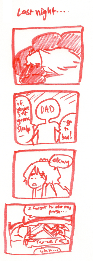 Sorry- last night I fell asleep on the couch after I overdosed on fish `n chips and woke up it was past 10- so my Dad sent me to bed.