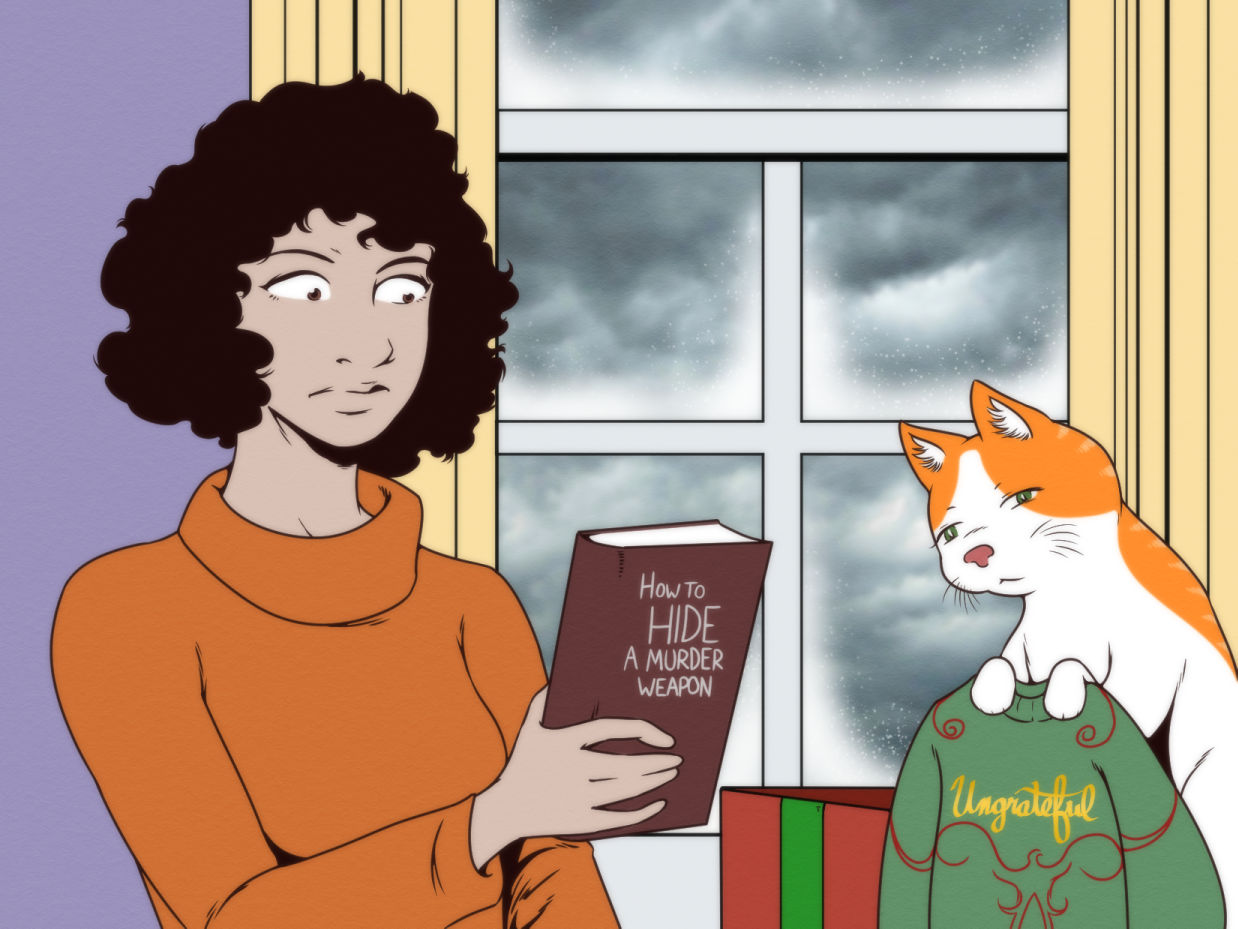 This is one really neat-looking piece, Huchicho. The coloring choice of the foreground and coloring of the background outside of the window, combined with the title written on the book and the surprised expression on the characters face, gives this scene this really balanced atmosphere of both cozy and excitingly ominous. It's a really fitting atmosphere for a classic murder mystery drama. I love looking at it🙂