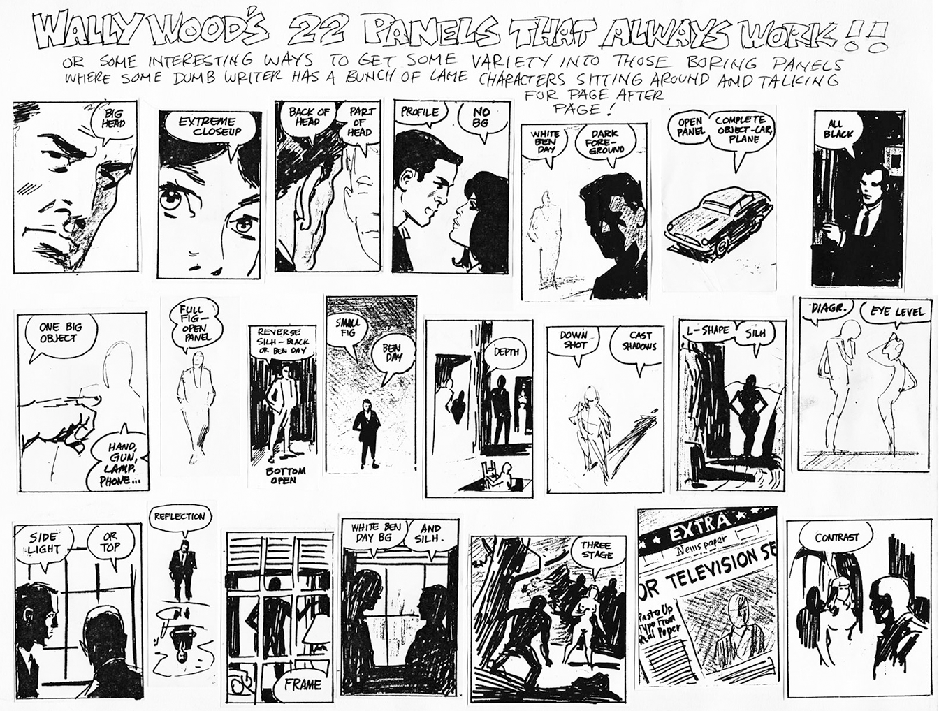 We'll be working from "Wally Wood's 22 Panels That Always Work," an iconic assembly of comic panels that tend to be particularly iconic in comic storytelling. Cloud Four has a larger write-up on them, but I also have the panels here for your reference.